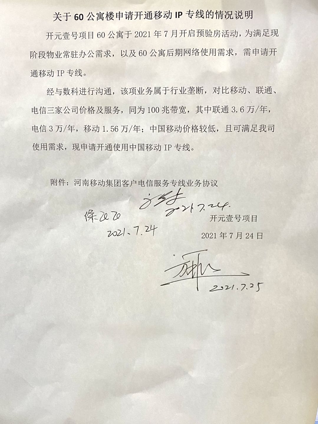 [To Parent Directory] 2021/7/27 9:37 180018 关于60公寓楼申请开通移动IP专线的情况说明.jpg 2021/7/27 9:37 209247 开元壹号项目移动专线合同.pdf