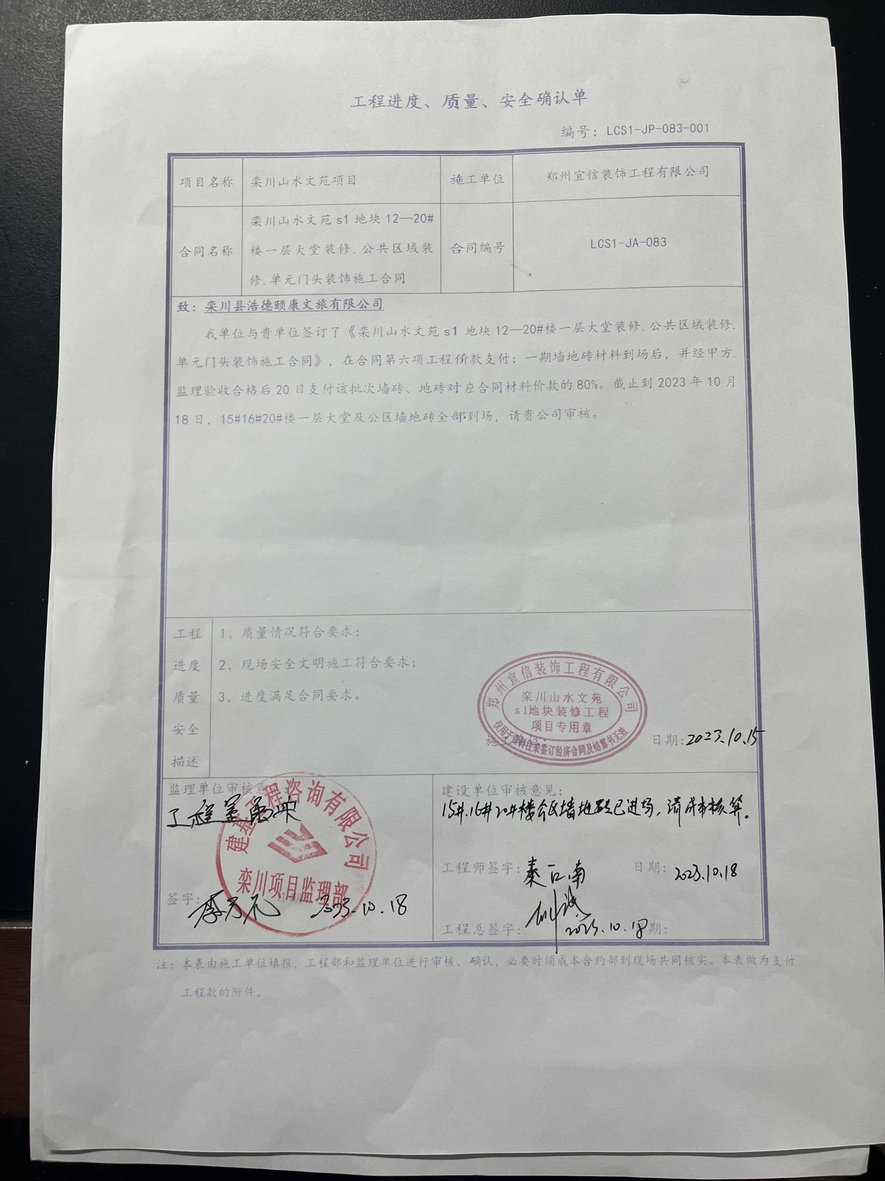 [To Parent Directory] 2023/11/6 9:06 56168 15#、16#、20#楼公区砖供货度款费用计算明细表2023.10.31.xlsx 2023/11/6 9:06 134962 1_15#、16#、20#楼公区砖供货度款费用计算明细表2023.10.31(1).pdf 2023/11/6 9:06 7092837 质量进度确认单.jpg 2023/11/6 9:06 1608274 进度款申请单.pdf