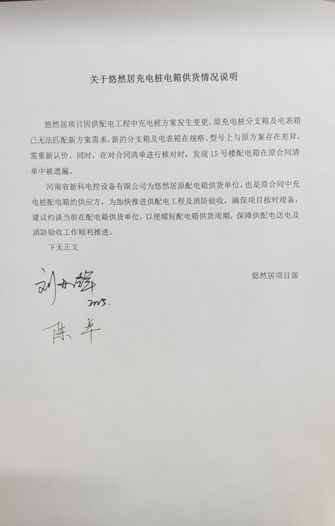 [To Parent Directory] 2025/3/15 9:32 591283 悠然居项目配电箱采购合同--补充协议(修改版3.6).doc 2025/3/15 9:32 390943 情况说明-悠然居项目增加分支箱、电表箱事项2025.2.28.jpg 2025/3/15 9:32 3184650 约谈记录--悠然居项目增加分支箱、电表箱事项+汇总表+明细表20250120.pdf